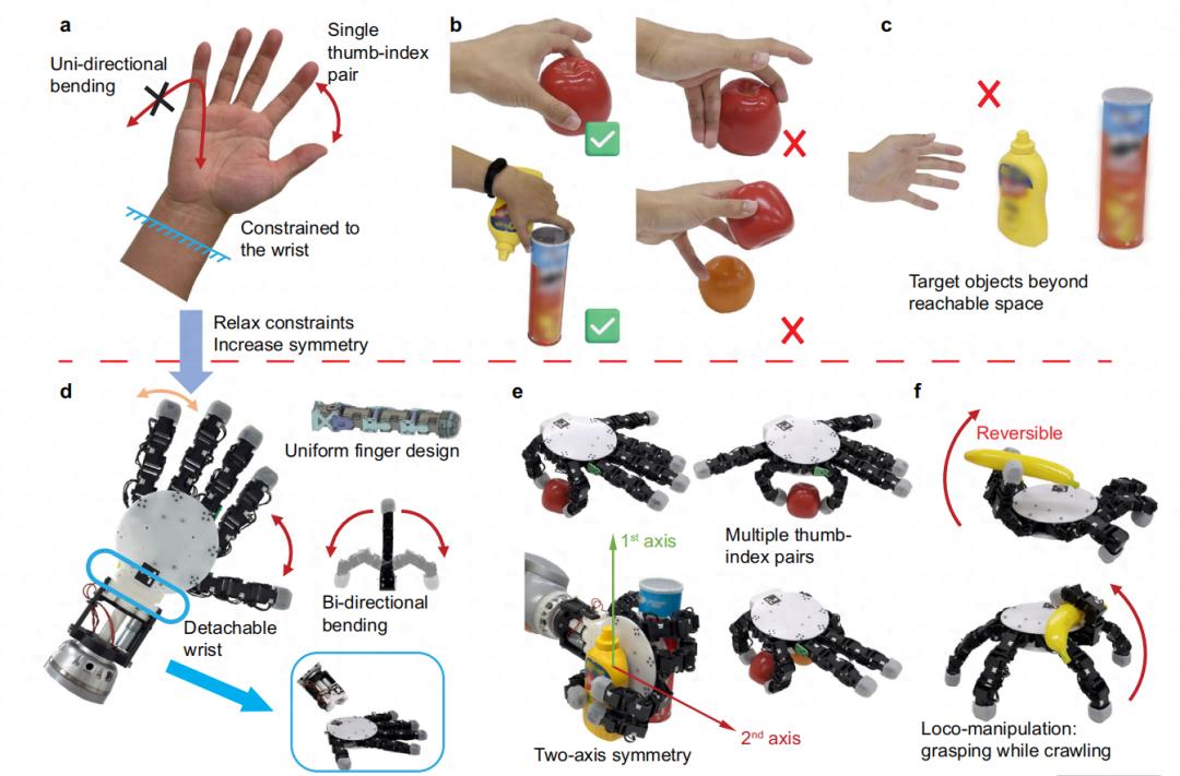 本次研究团队从自然界寻找到了灵感。他们发现章鱼的腕足不仅可以爬行还可以抓握,螳螂虾的捕食肢同时也是它的行走足。基于此,研究团队设计了一款完全对称的机械手,每根手指的结构相同,每根手指也都能够双向弯曲,但其活动范围是人类手指的两倍以上。