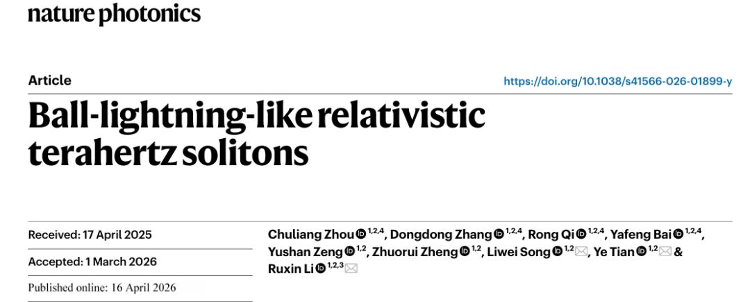 4 月 16 日,来自中国科学院上海光学精密机械研究所的一支研究团队,在国际顶级期刊《自然·光子学》(Nature Photonics)上发表论文,报告他们首次在实验室中可控地生成了一种具有球状闪电典型特征的宏观电磁孤子。这个发光的等离子体球,直径达到毫米量级,存活时间超过 100 纳秒,会发出从紫外到红外的宽谱辐射,还呈现出与元素电离过程对应的特征光谱线。