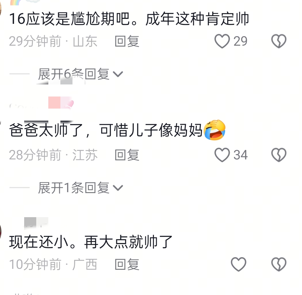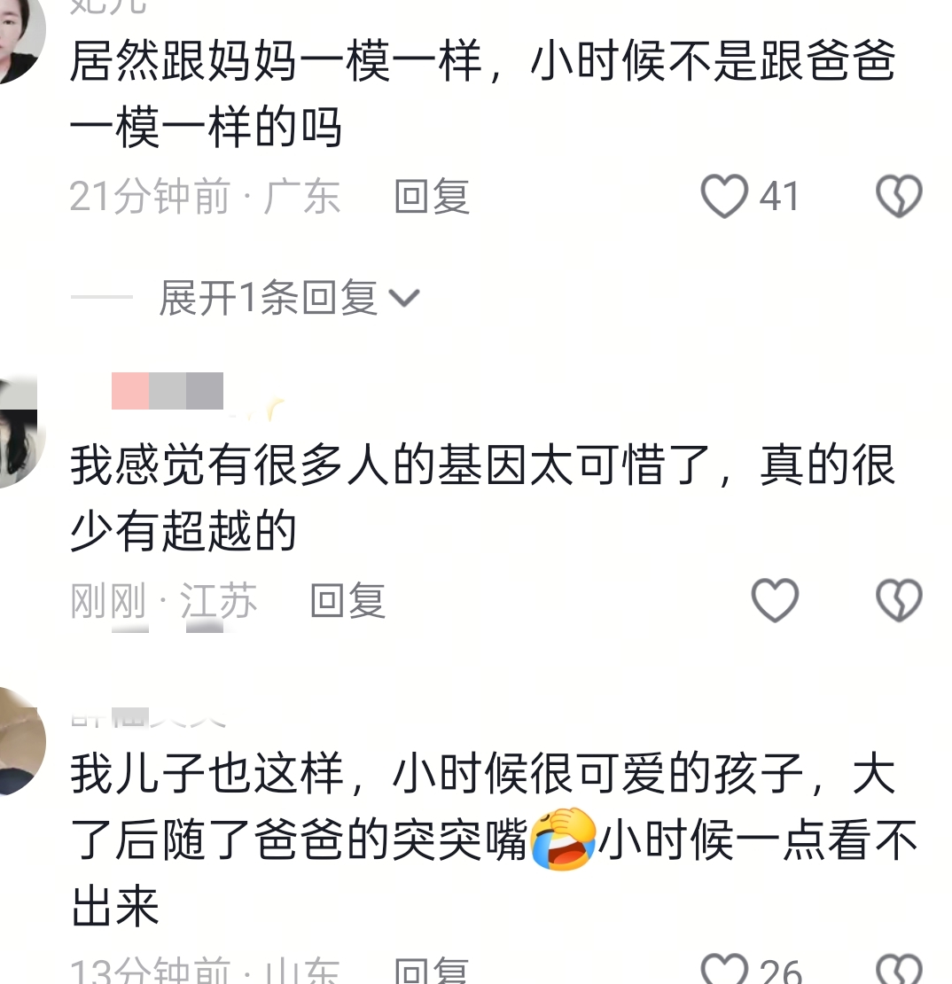 评论区里还有网友调侃“找老婆一定要找漂亮的”,看似玩笑话,也道出了基因遗传的随机性,孩子的长相本就会随机继承父母的特征,有的像爸有的像妈,Kimi更像妈妈陈若仪,也是再正常不过的事,没必要过分苛责。