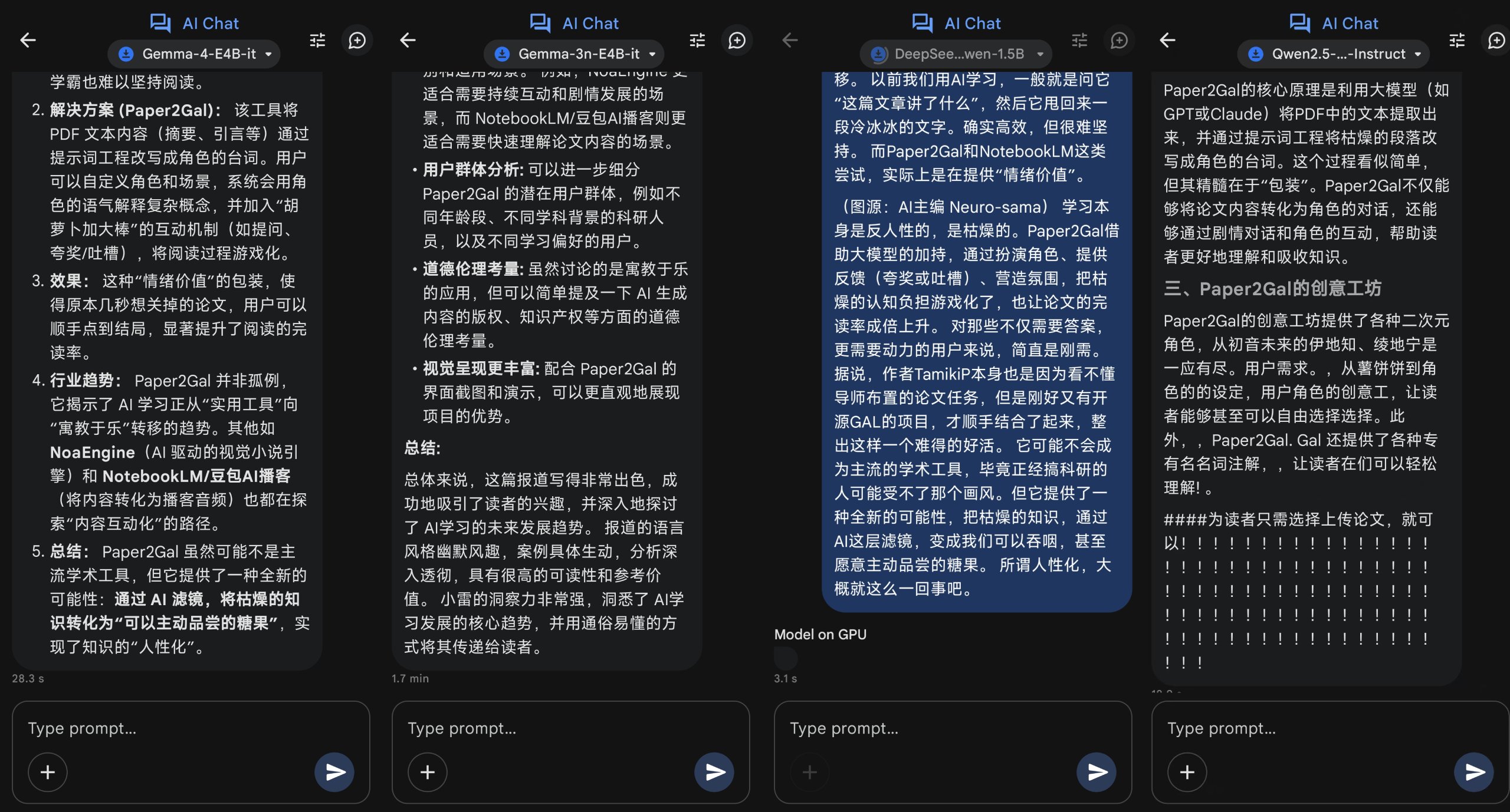其中,只有Gemma 3n-E4B和Gemma 4-E4B算是能完成任务,但是前者耗时将近两分钟,而且给出的答案抓不住重点,后者给出来的答案更加简明扼要。