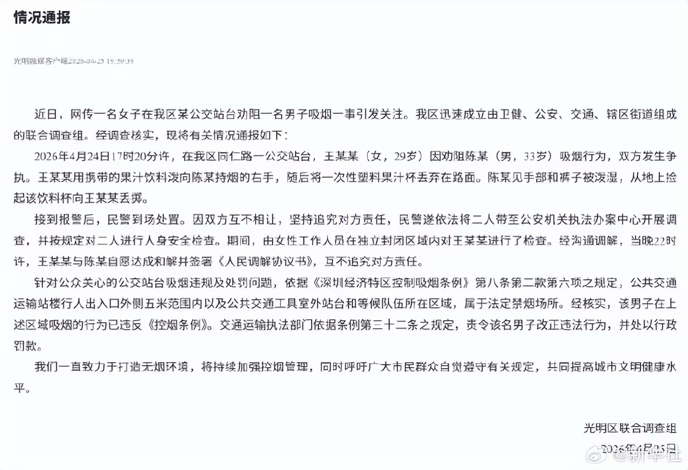对此,光明区联合调查组在通报中明确澄清:对王某某的检查全程由女性工作人员在独立封闭区域进行,完全符合执法规范,不存在不当执法、人格侮辱等情况,女子也未被处以拘留。