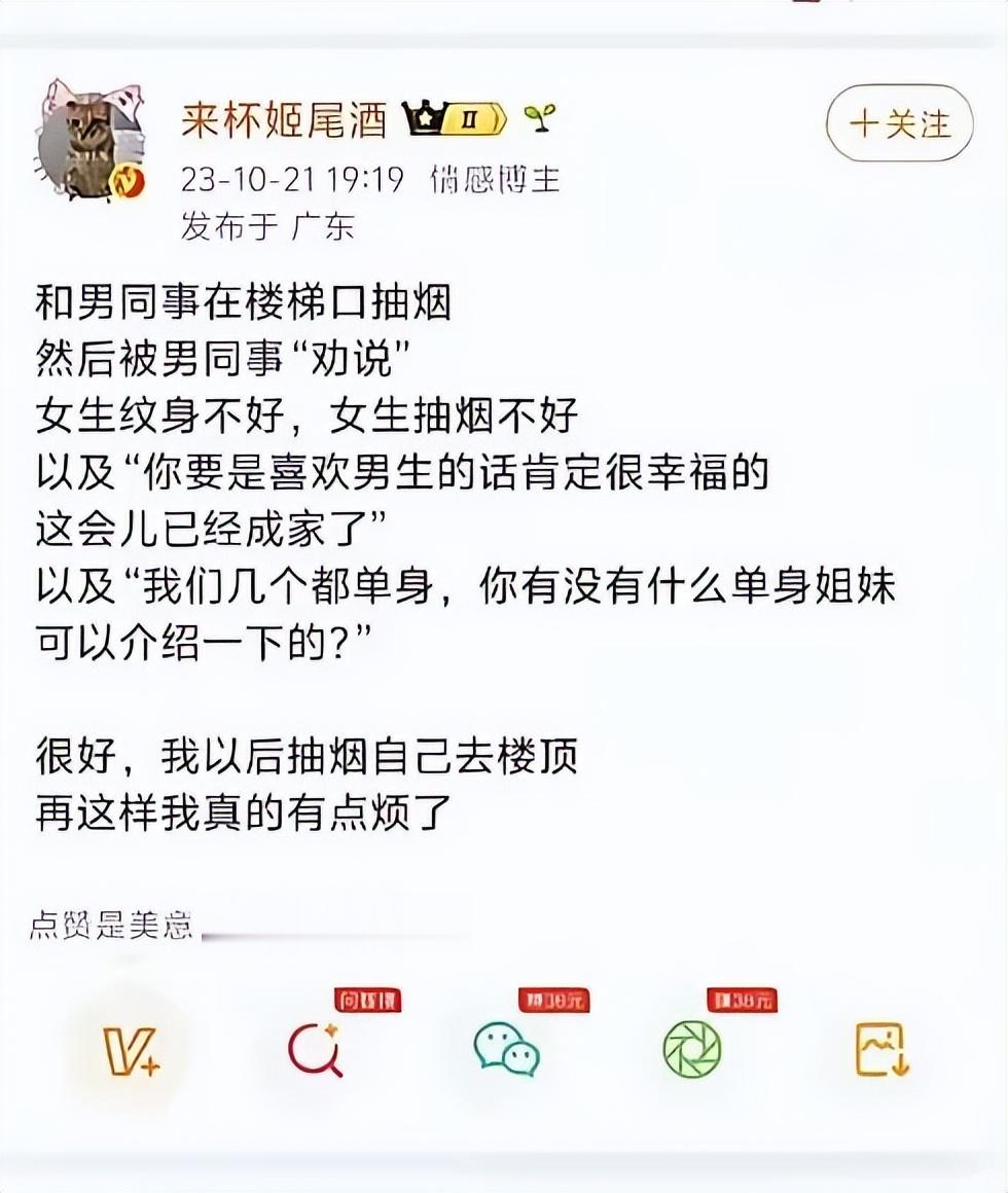 有些网友顺着发帖女生ID找到了她的账号,扒出她很早之前的言论,称当时她的同事也在公共场合吸烟,发表她自己的看法。