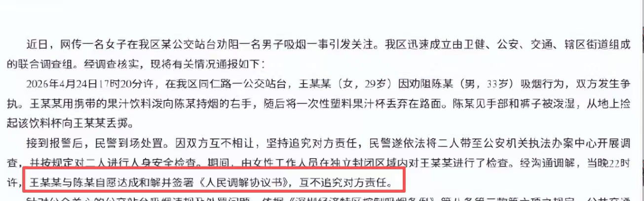 唯独王某某实在忍无可忍,她心里清楚,公交站台属于法定禁烟区域,在公共场合吸烟不仅不文明,更直接影响他人身体健康,更何况深圳控烟管理一向严格,站台内吸烟本就违反规定。