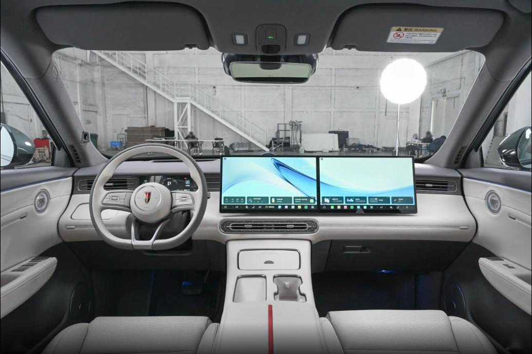 拉开车门就能闻到很淡的皮革味,车内用料很实在,手能碰到的地方基本都是软包。中控台是阶梯造型,层次感很强,上层软质搪塑、中间饰板、下面皮质包裹,缝线也很精致。双色三辐方向盘握感饱满,前面是8.88英寸内嵌仪表盘,数字看着很清楚。中间是双联屏,两块15.6英寸2.5K屏拼在一起,画质细腻得像iPad,悬浮设计还有物理隔断,不反光不晃眼。