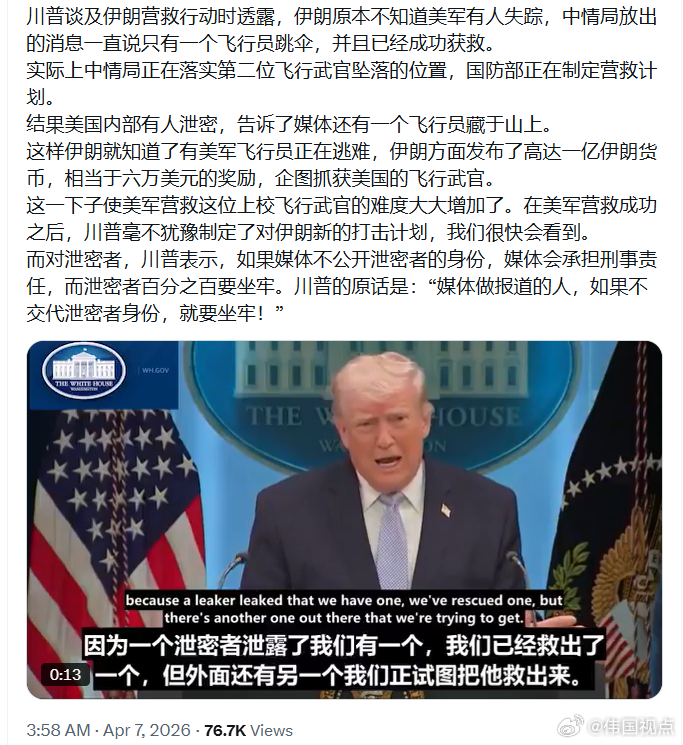 参议员多数党领袖约翰·图恩:我想向所有参与在伊朗营救两名F-15E机组成员的英勇